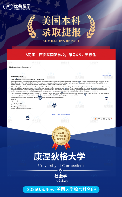 该州治安良好,禁毒禁枪,生活与学习环境安全舒适,被誉为新英格兰地区的“教育高地”,十分适合潜心求学。最后,再次恭喜优弗学员拿到康涅狄格大学本科录取offer!希望在未来的留学路上,一切顺利,实现自己的所有梦想与价值!